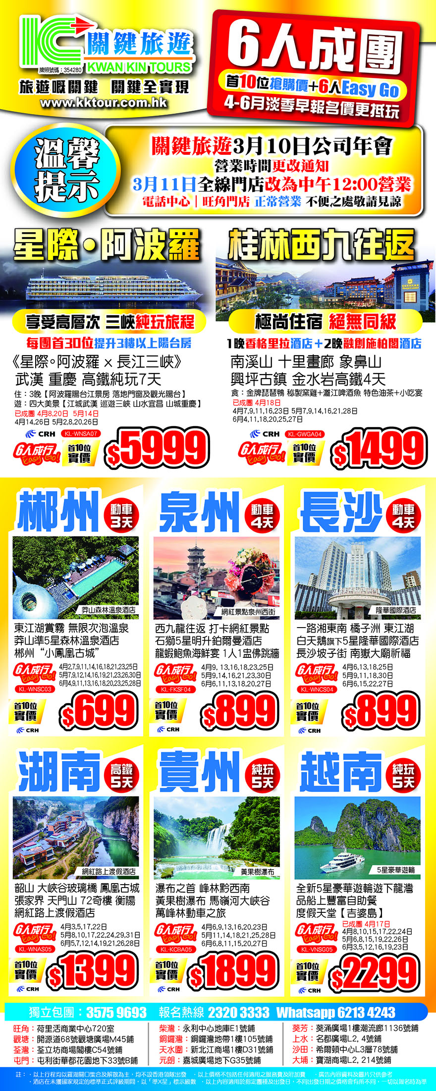 熱線電話 : 2320 3333 旅遊咨詢 WhatsApp : 6745 3024 / 6213 4243