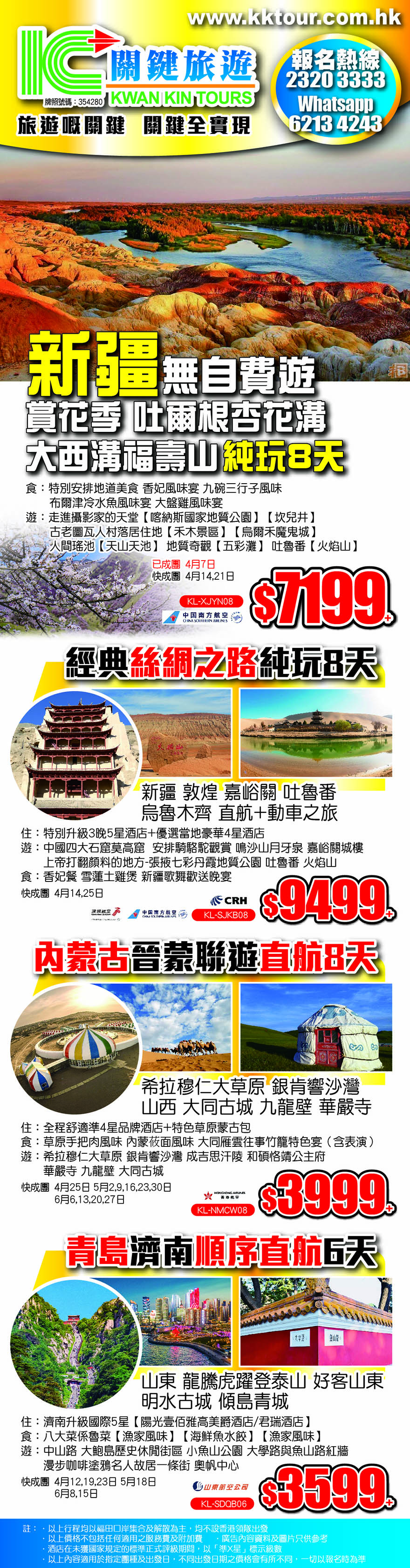 縱橫神州,新疆、經典絲綢之路、內蒙古、山東青島新品推介;黃山、普陀山,本週真優惠;6人成團Easy Go;2024-03-22