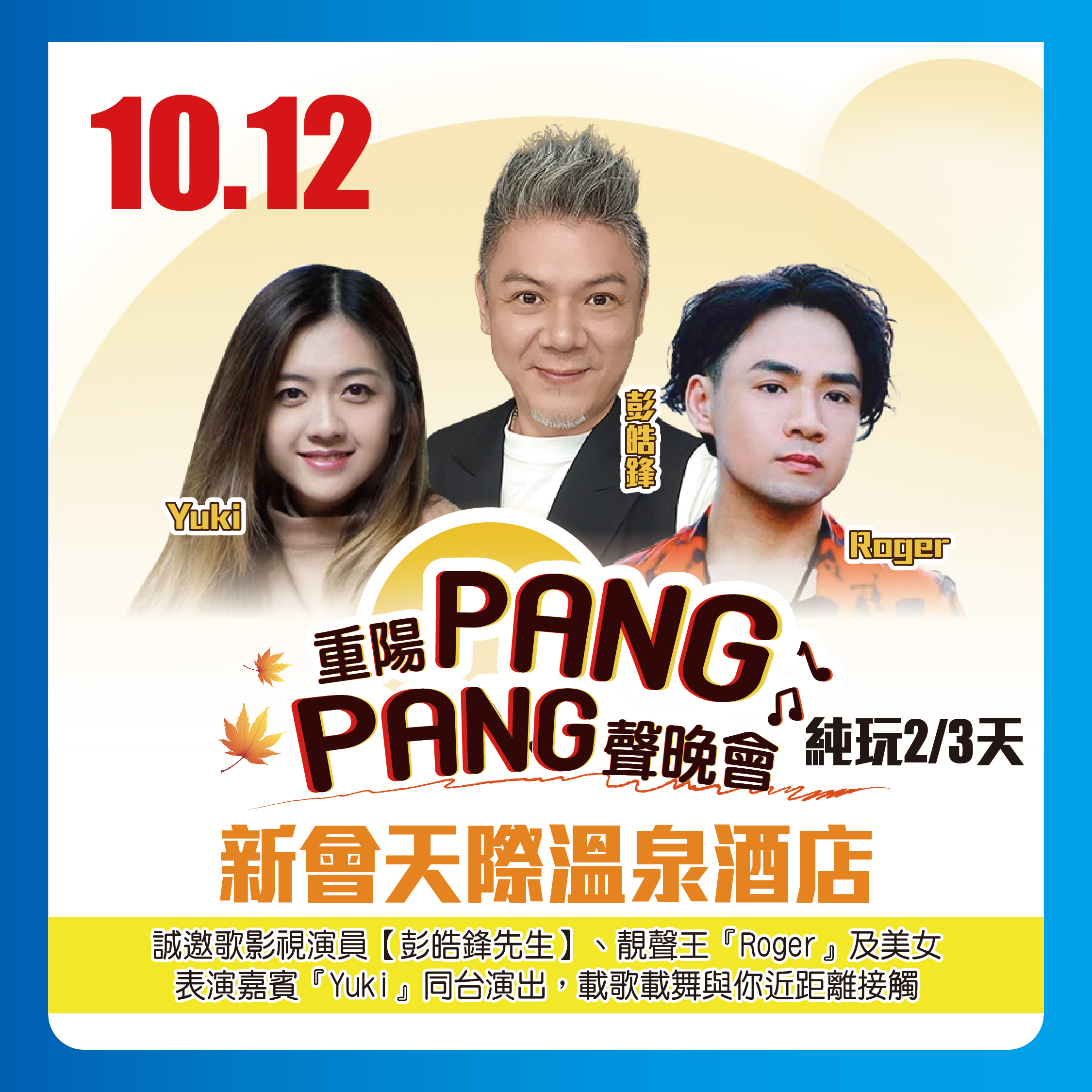 重陽PANG PANG聲晚會!誠邀歌影視演員【彭皓鋒先生】、靚聲王『Roger』及美女 表演嘉賓『Yuki』同台演出,載歌載舞與你近距離接觸!2024-09-11
