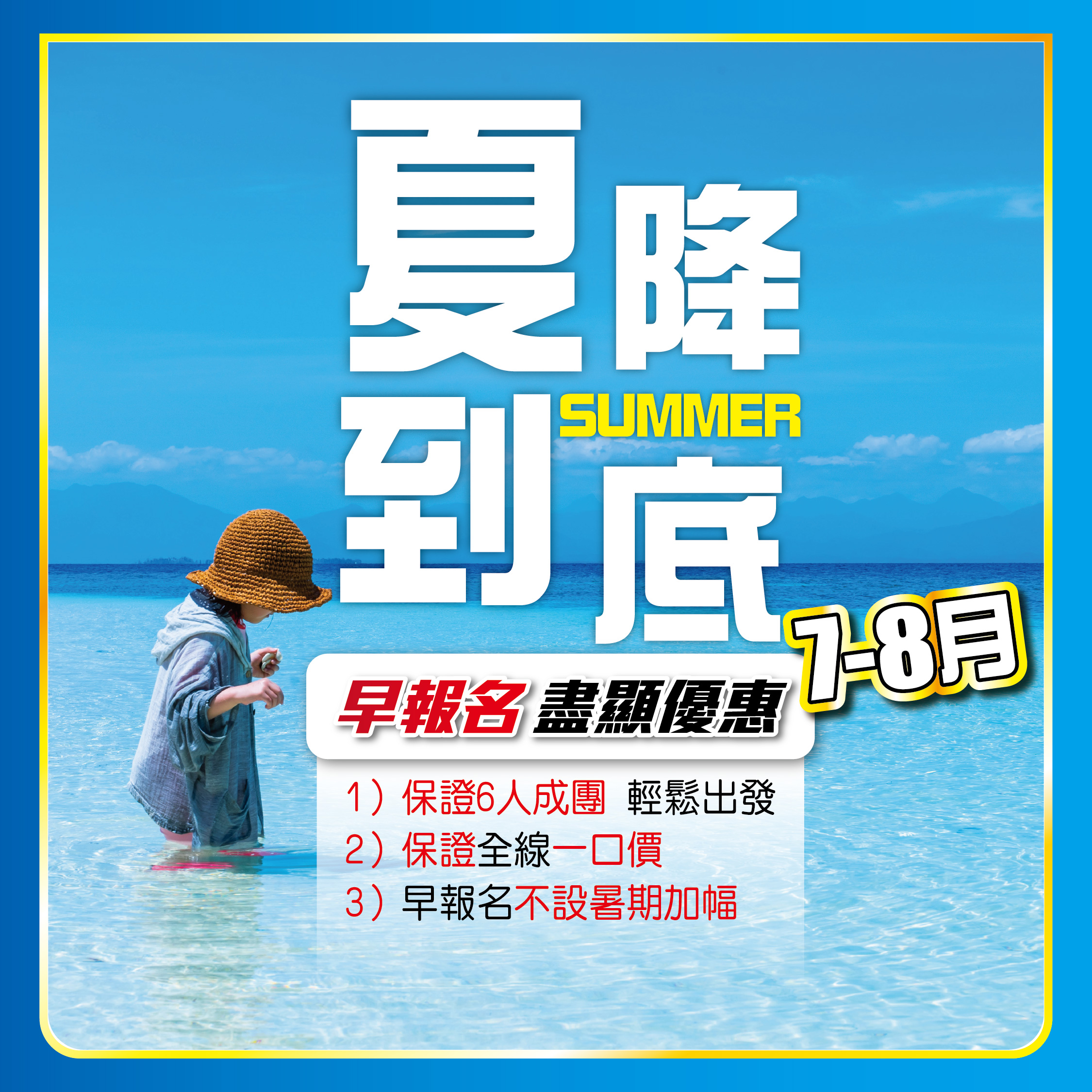 夏降到底(summer)7-8月早報名盡顯優惠!1)保證6人成團 輕鬆出發! 2)保證全線一口價! 3)早報名不設暑期加幅!2024-06-18