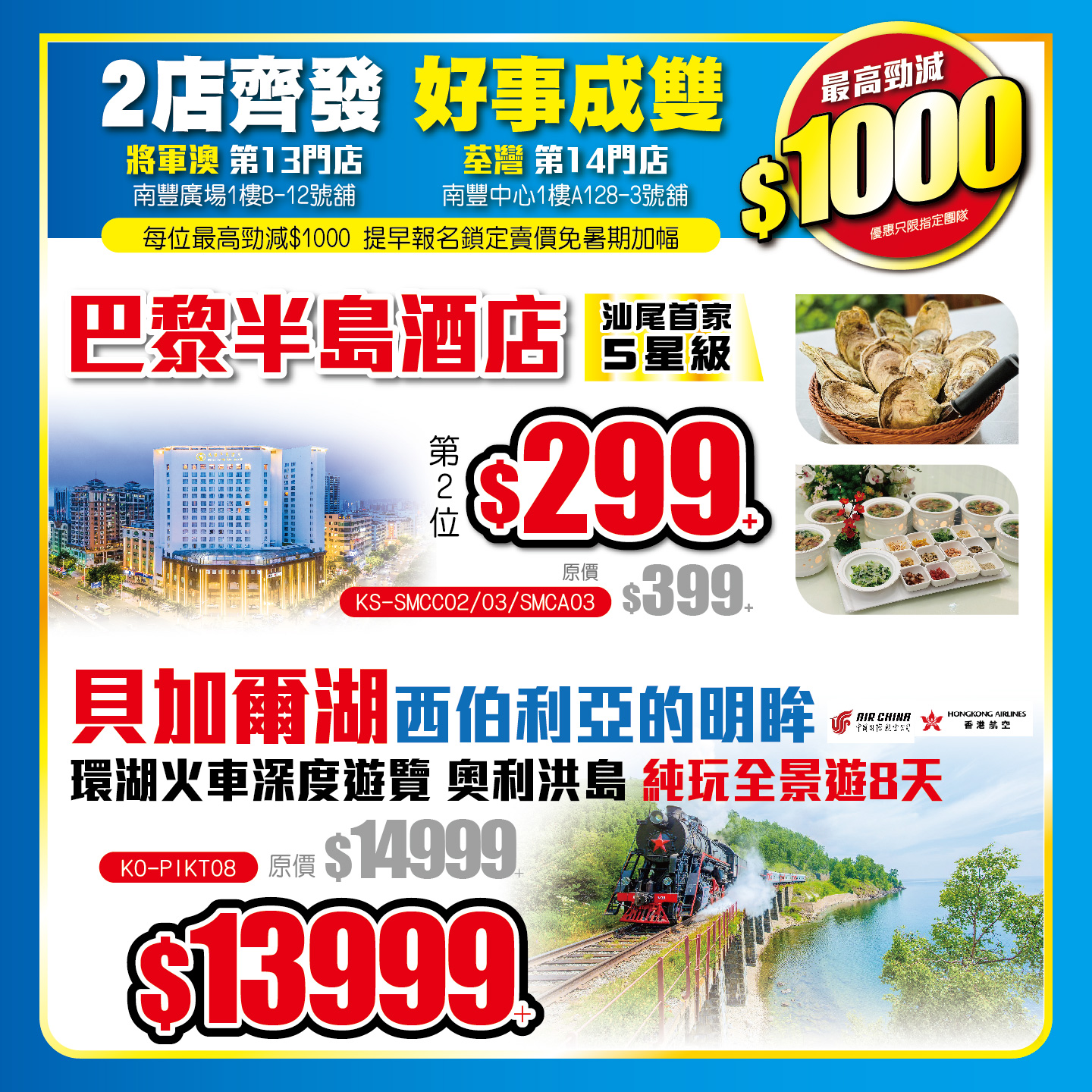 好事成雙,2店齊發!每位最高勁減$1000,提早報名,鎖定賣價免暑期加幅!汕尾首家5星級巴黎半島酒店,2人同行第2位$299+!貝加爾湖 環湖火車深度遊 直航8天!2024-05-07