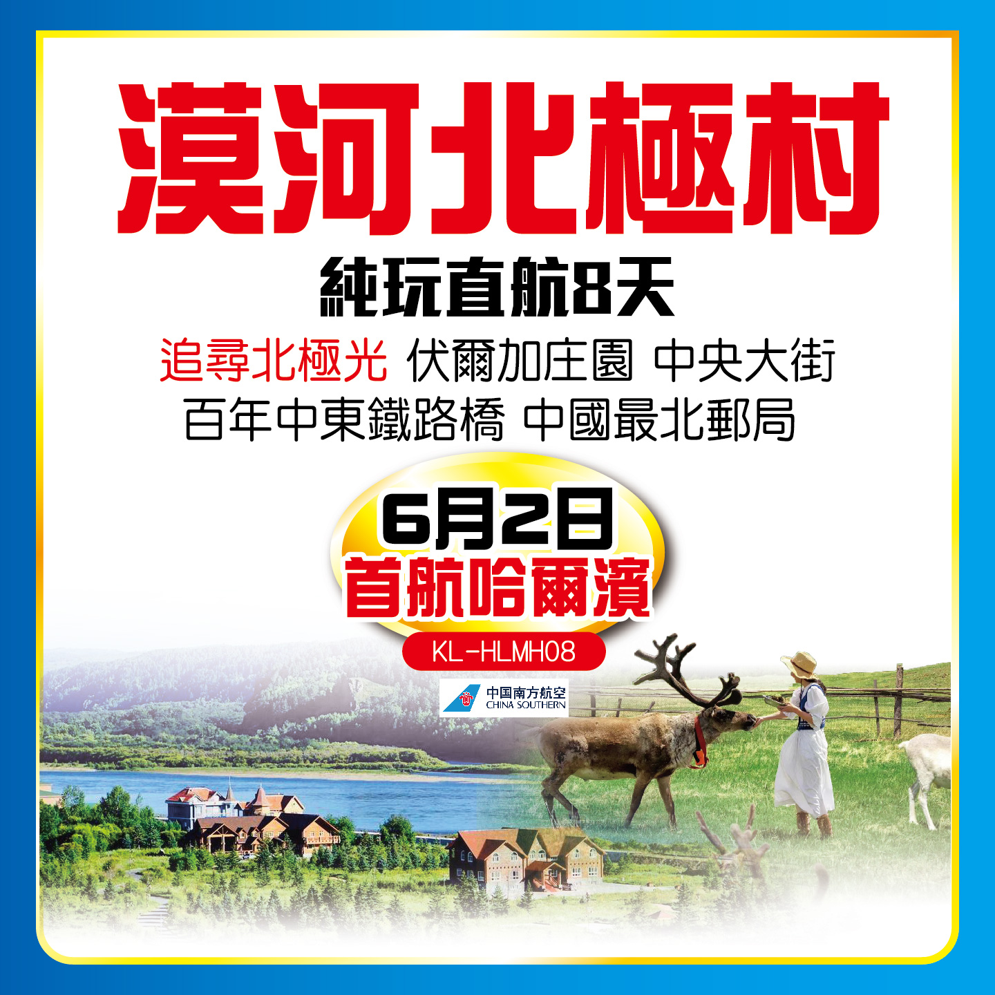 6月2日,首航哈爾濱,漠河北極村純玩直航8天,追尋北極光、伏爾加莊園、中央大街、百年中東鐵路橋、中國最北郵局,重本入住北極山莊,更多機會准尋極光;2024-05-10