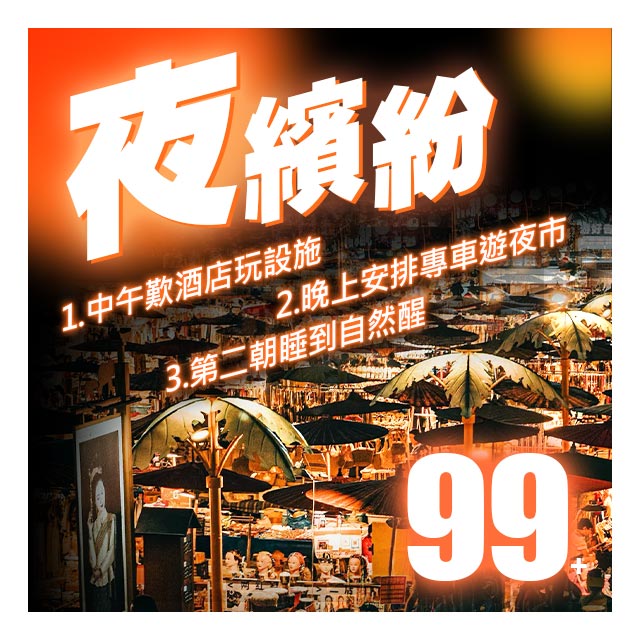 【夜繽紛】1.中午歎酒店玩設施 2.晚上安排專車遊夜市 3.第二朝睡到自然醒 玩轉佛山功夫夜市2天只要$99+!